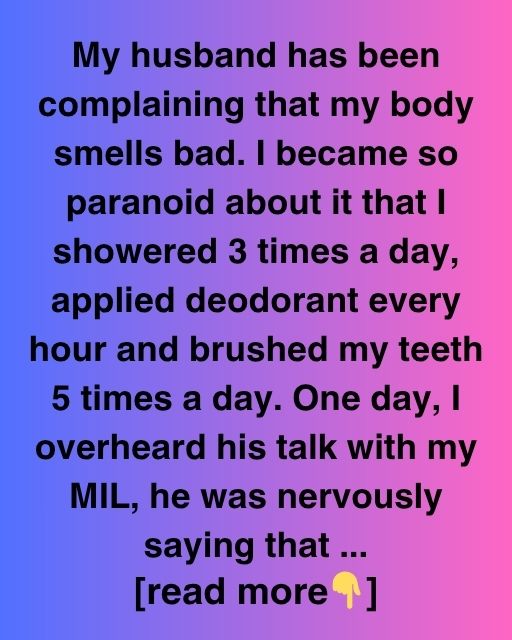 My husband has been complaining that my body smells bad. I became so paranoid about it that I showered 3 times a day, applied deodorant every hour and brushed my teeth 5 times a day. One day, I overheard his talk with my MIL, he was nervously saying that he didn’t know how to keep up the lie much longer.
