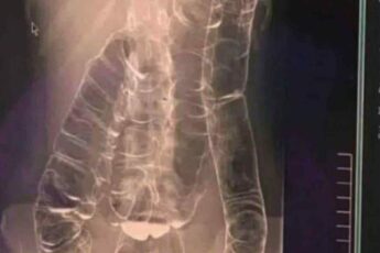 This is an X-ray image of a young woman who suffered from chronic constipation. One day, after experiencing continuous symptoms for over two weeks, she went for a medical check-up and received the X-ray results shown below in comm…